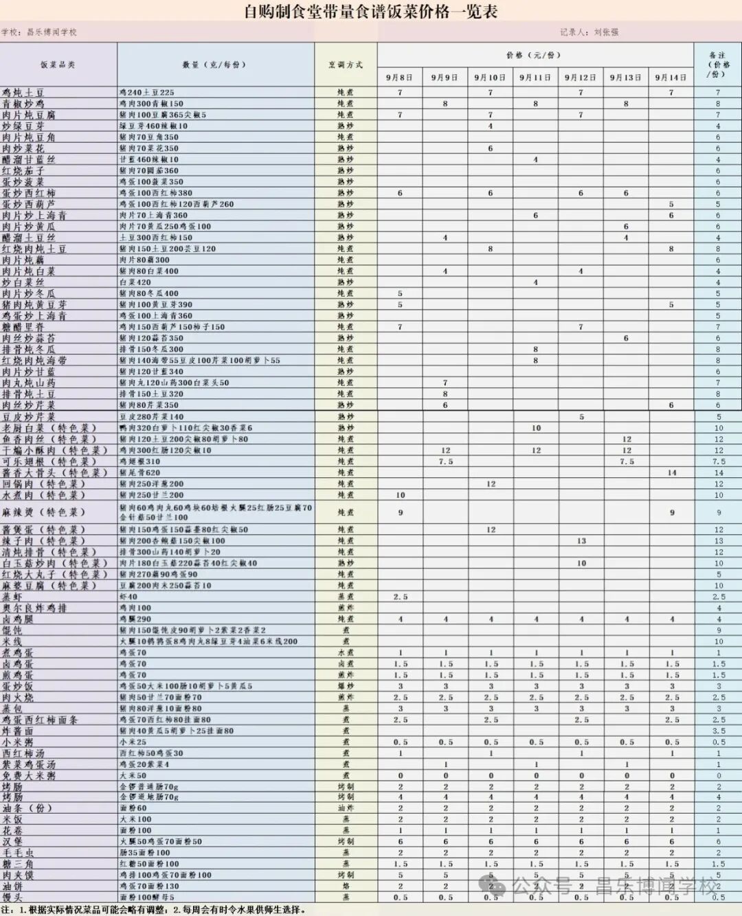 昌乐博闻学校自购制食堂带量食谱饭菜价格一览表(9.8—9.14)