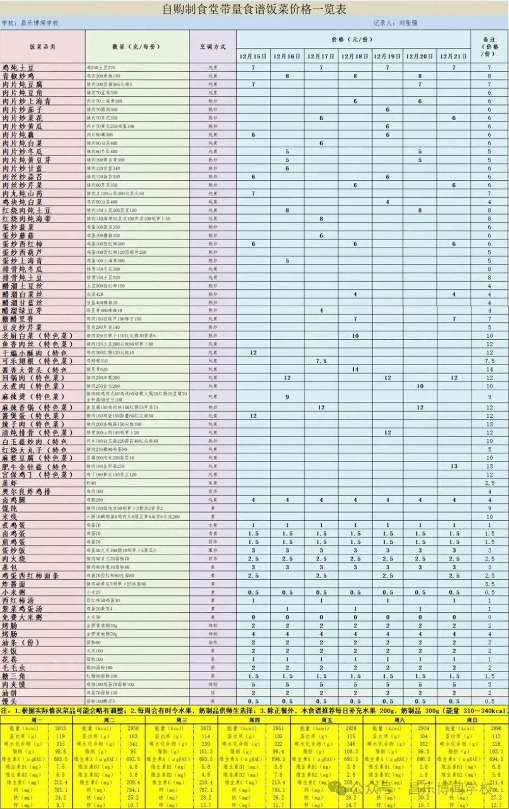 昌乐博闻学校自购制食堂带量食谱饭菜价格一览表(12.15-12.21)
