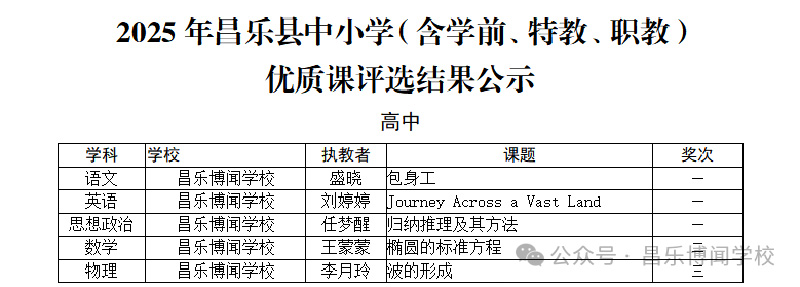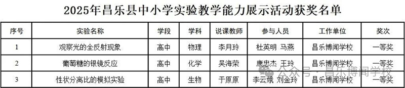近日,昌乐县教体局公布了2025年昌乐县中小学实验教学优质课评选活动、2025年昌乐县中小学实验教学能力展示活动和2025年昌乐县中小学(含学前、特教、职教)优质课评选活动获奖名单,我校教师凭借扎实的专业素养和出色的教学能力,喜获佳绩。